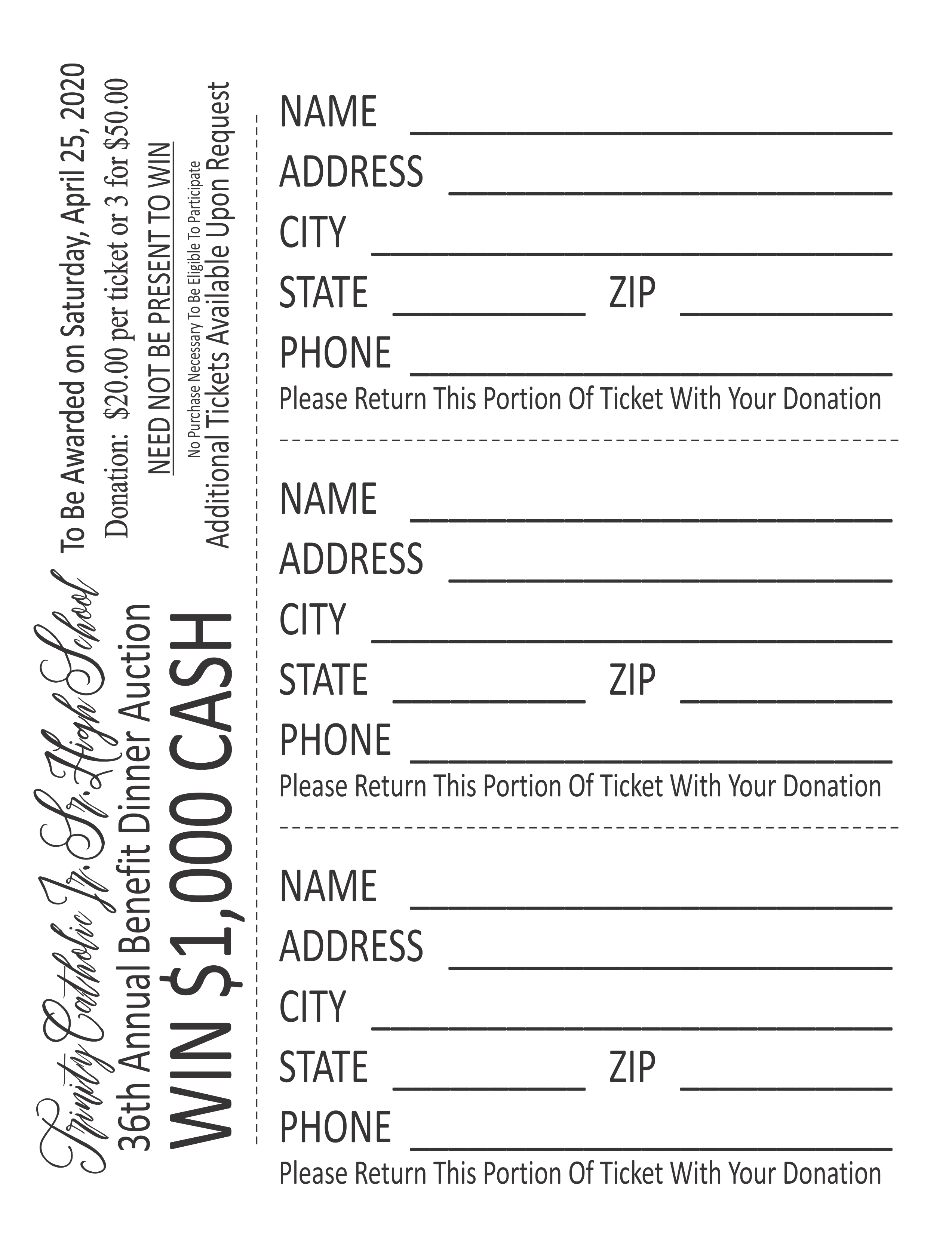 You may also purchase raffle tickets by mail: Enclose your name, phone, email, number of tickets, and cash/check payable to Trinity Catholic. Mailed ticket requests MUST be received and paid no later than Friday, June 26th to be entered in the drawing. TCHS @ 1400 East 17th Avenue; Hutchinson, KS 67501
